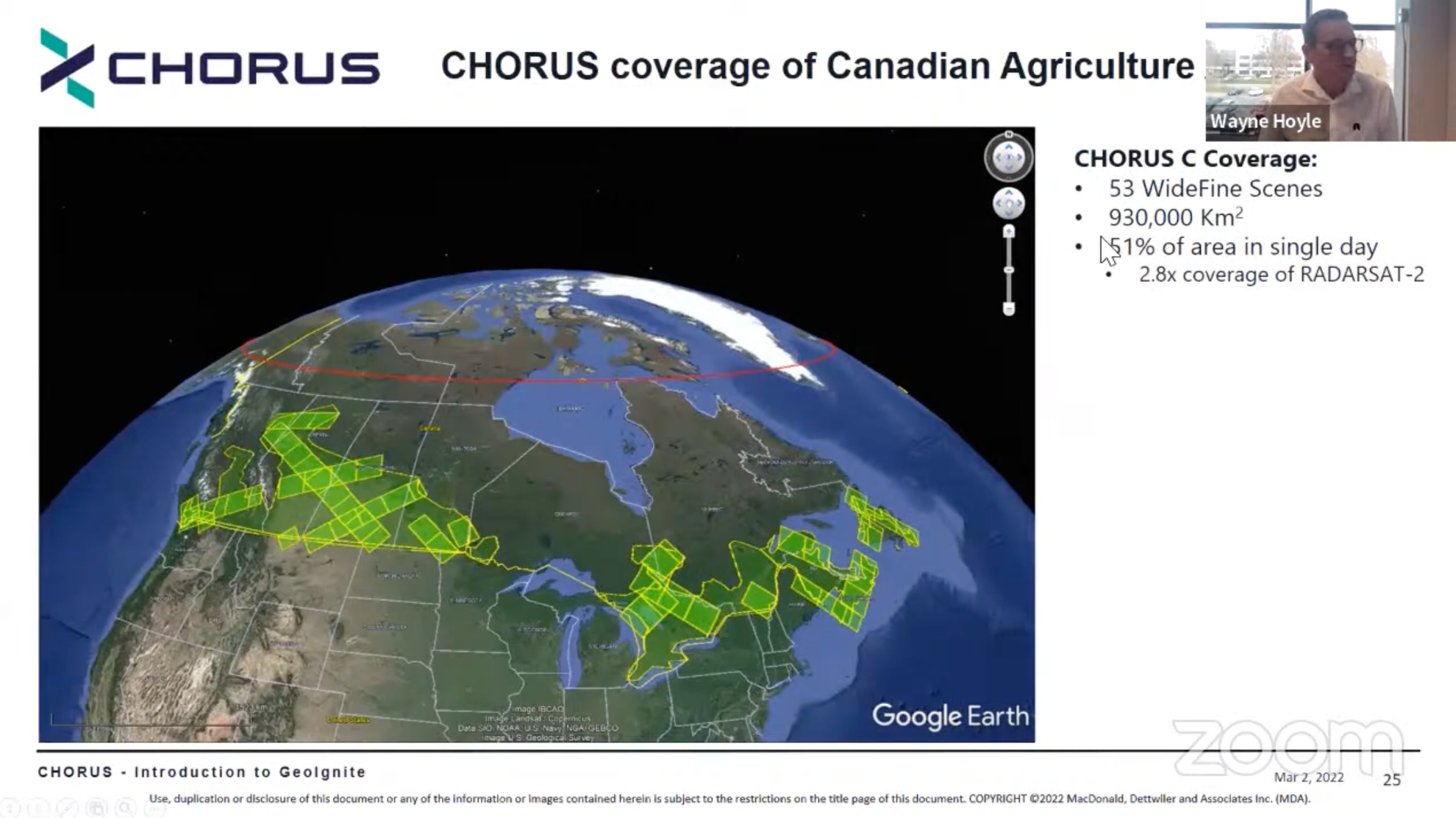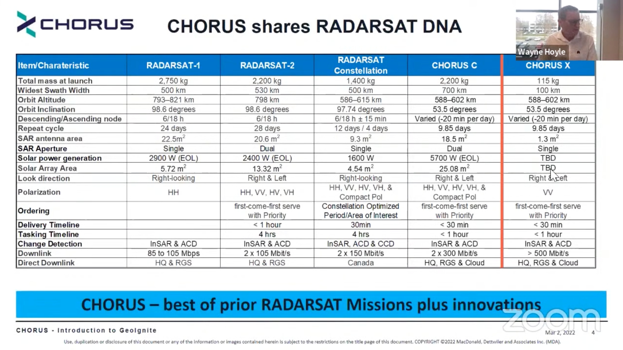 MDA’s Wayne Hoyle, Senior Director of Business Development, gave a detailed presentation at the GeoIgnite conference about the capabilities of their new CHORUS Synthetic Aperture Radar (SAR) satellite constellation.