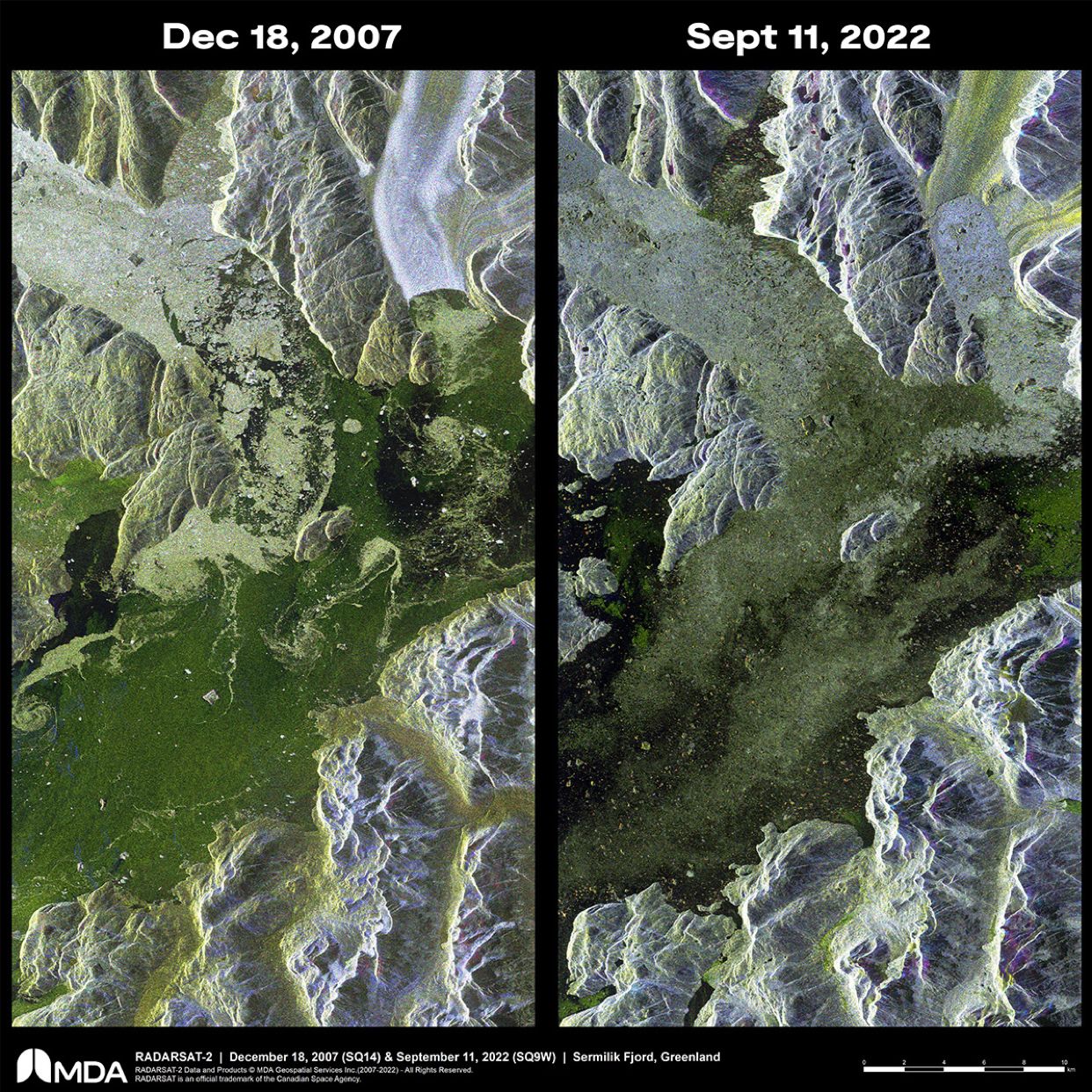 The first image, detailed below alongside the new image and taken in the same imaging mode, was taken by RADARSAT-2 of the Sermilik Fjord in East Greenland 14 years, 8 months, and 24 days ago.